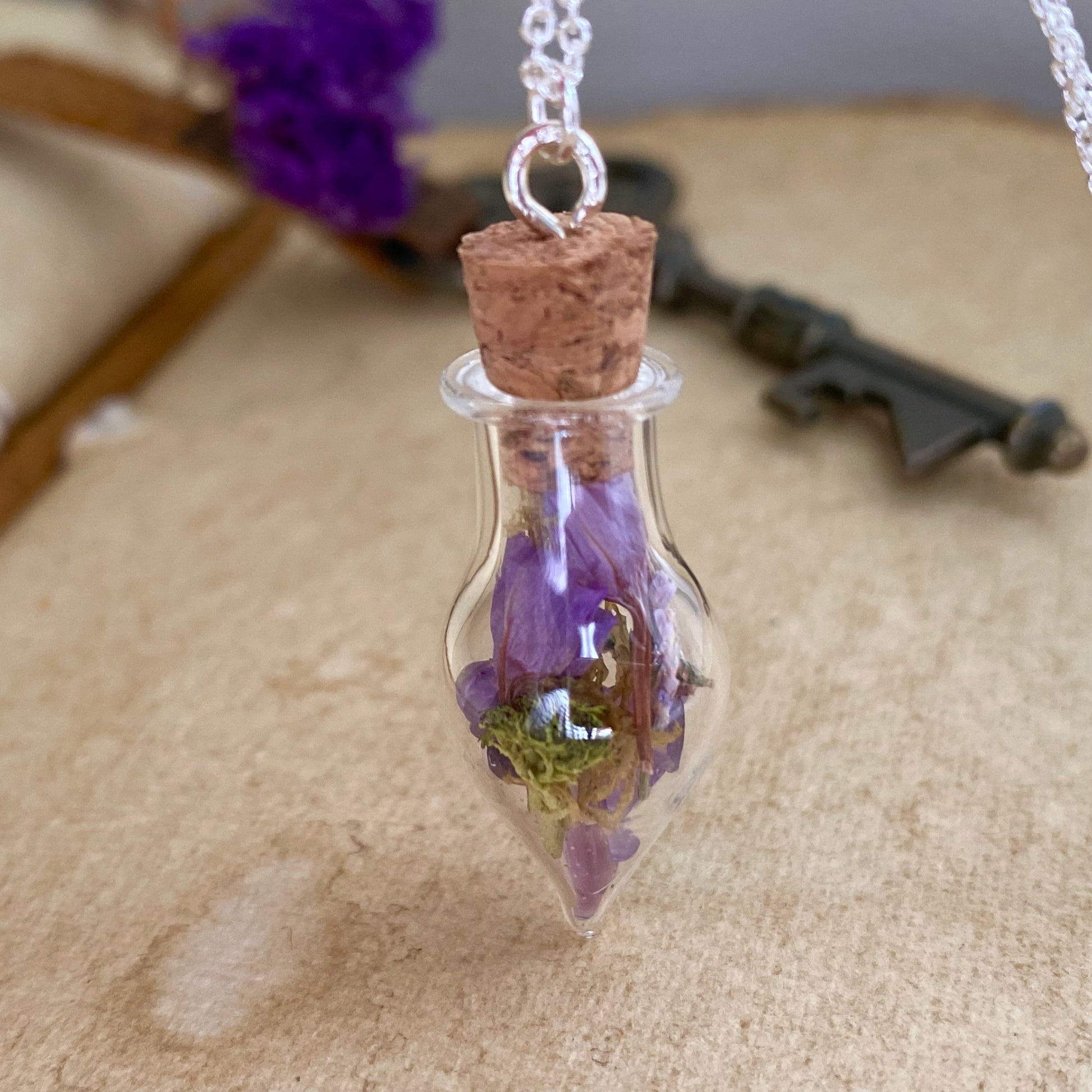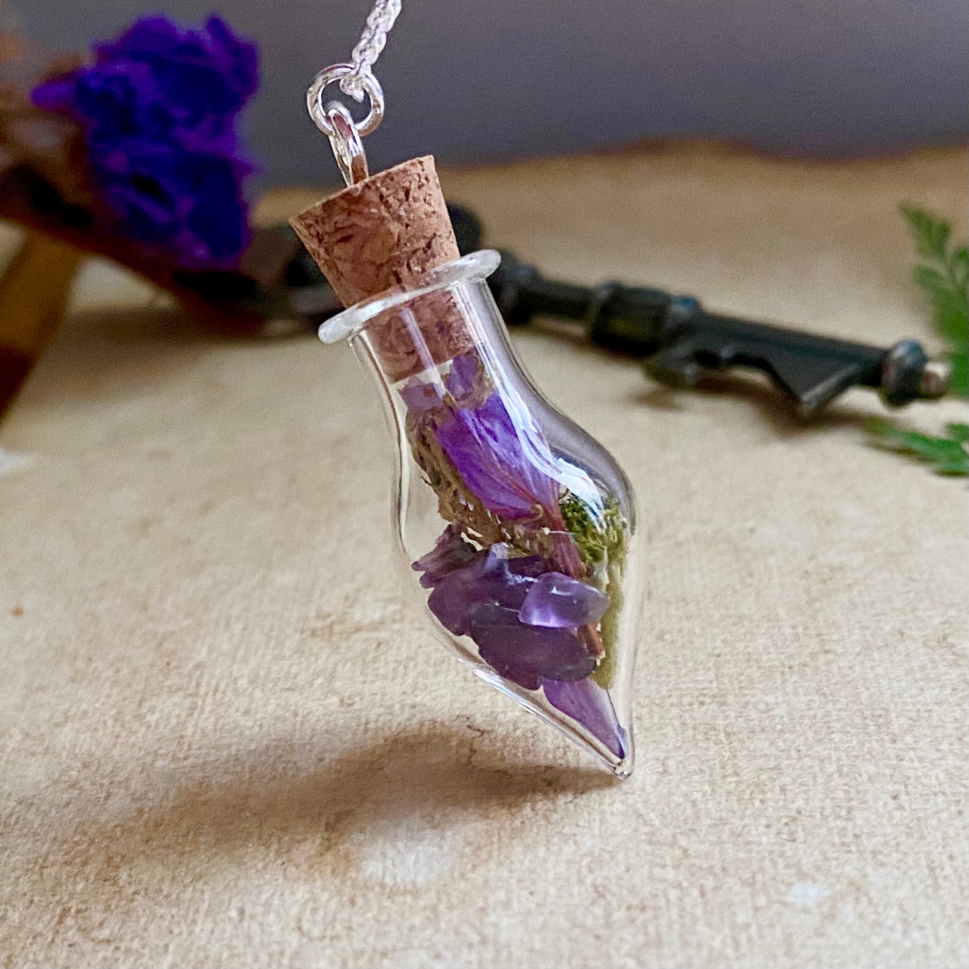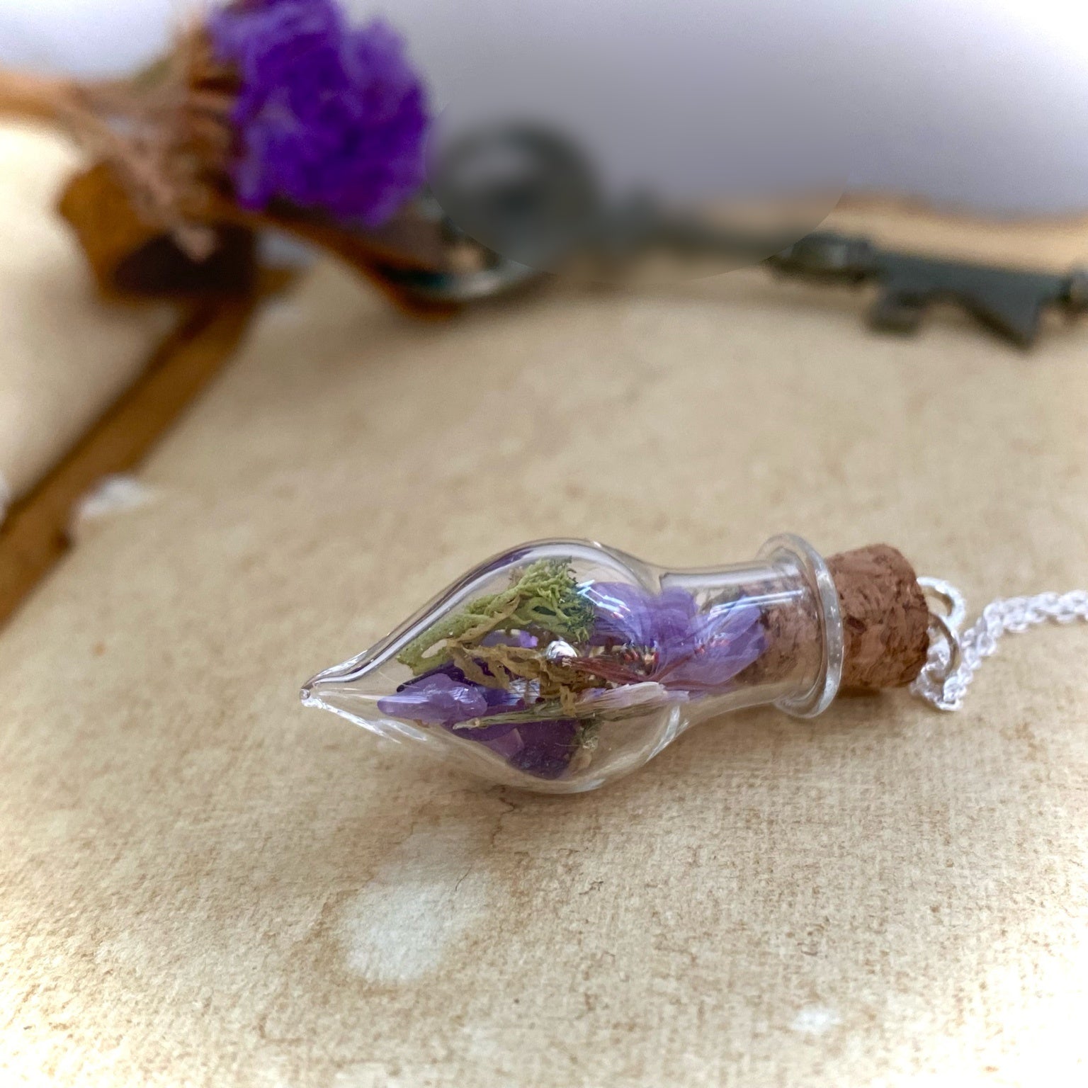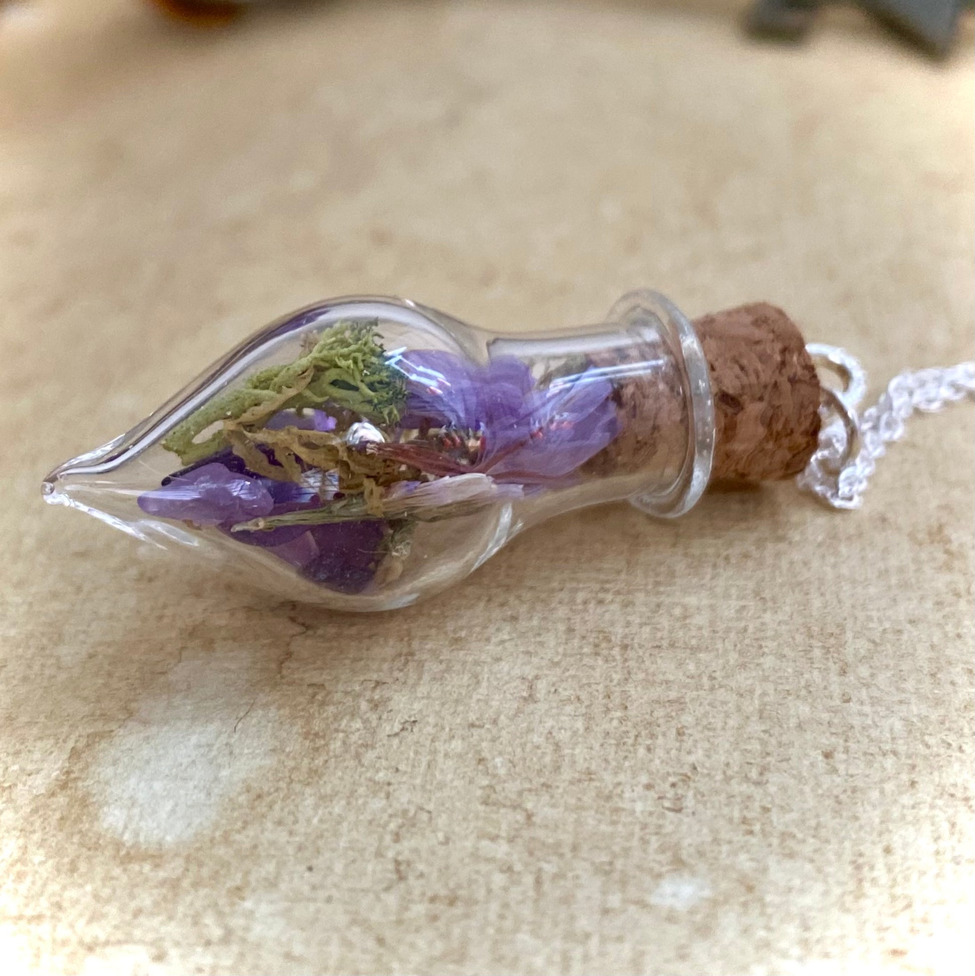 Amethyst, moss, and blossoms of statice and sea lavender, sealed within glass and topped with a cork stopper A tiny keepsake for calm and quiet strength.