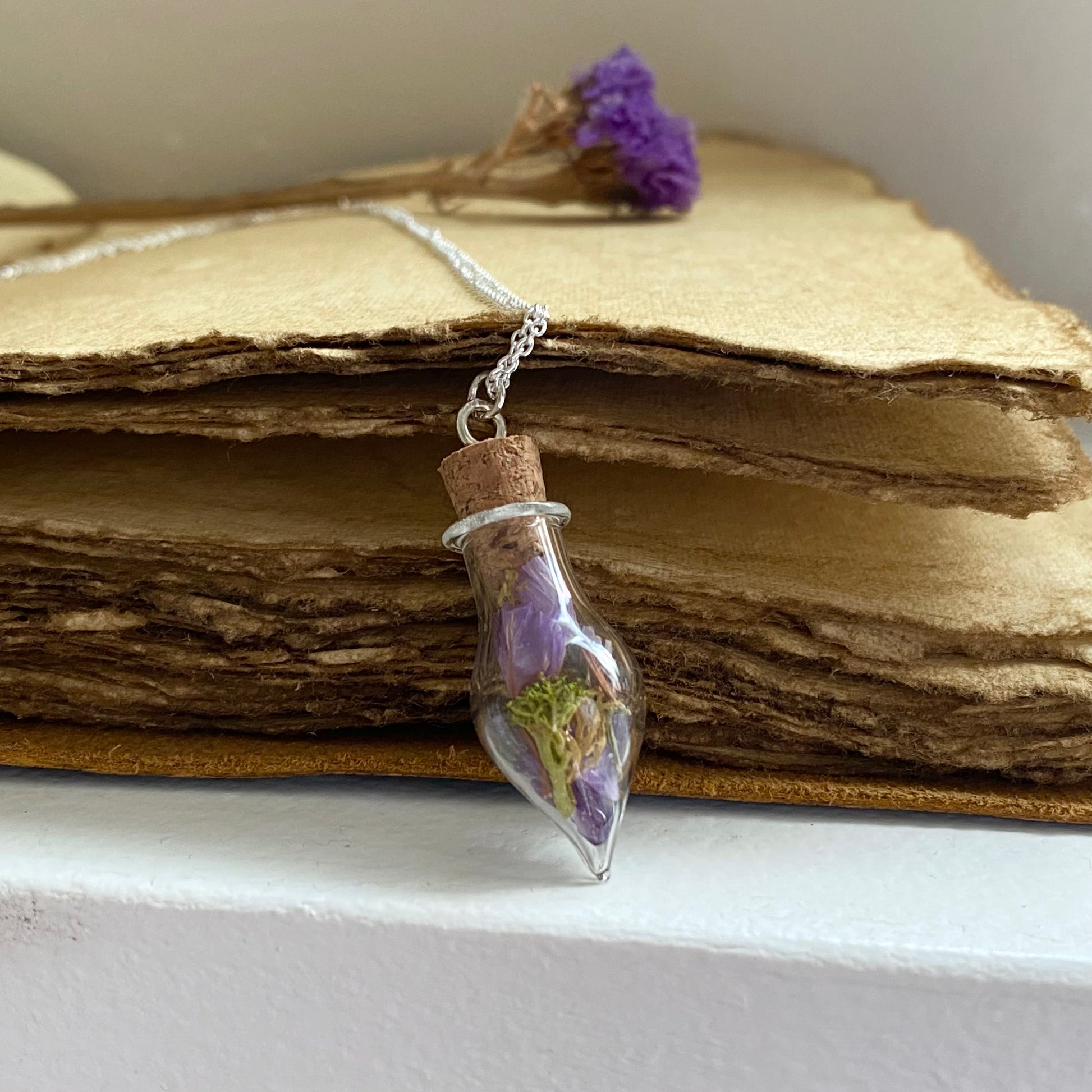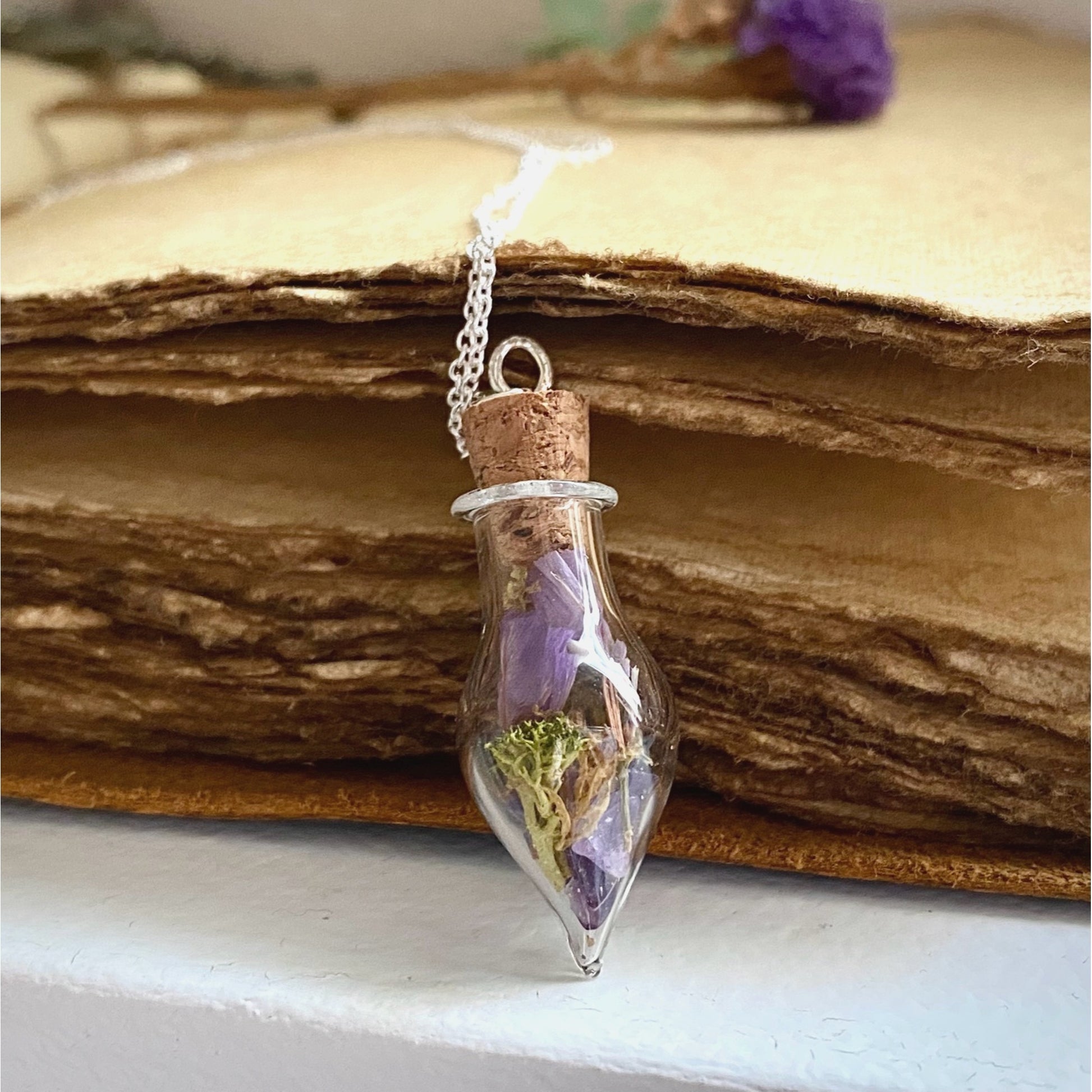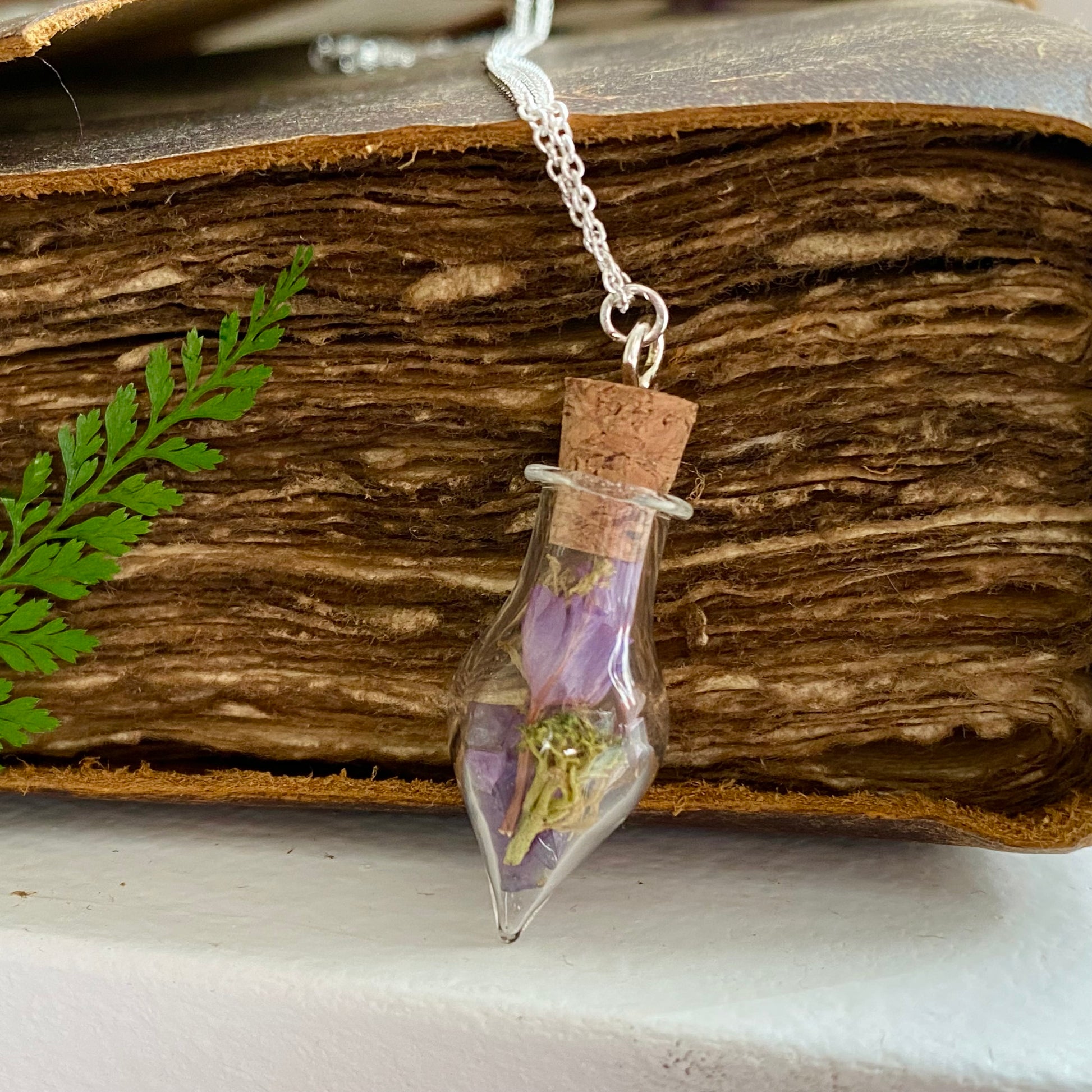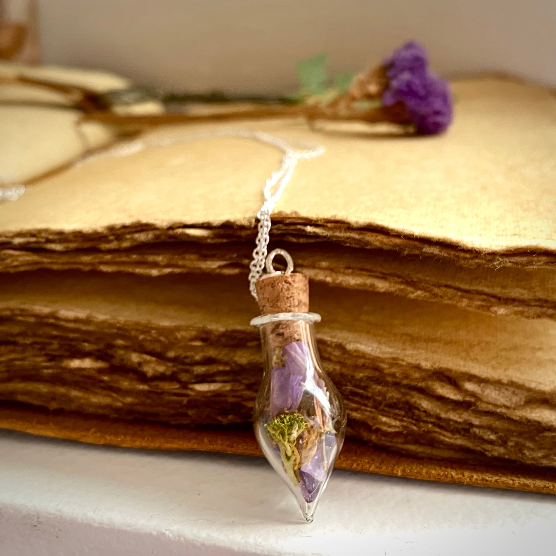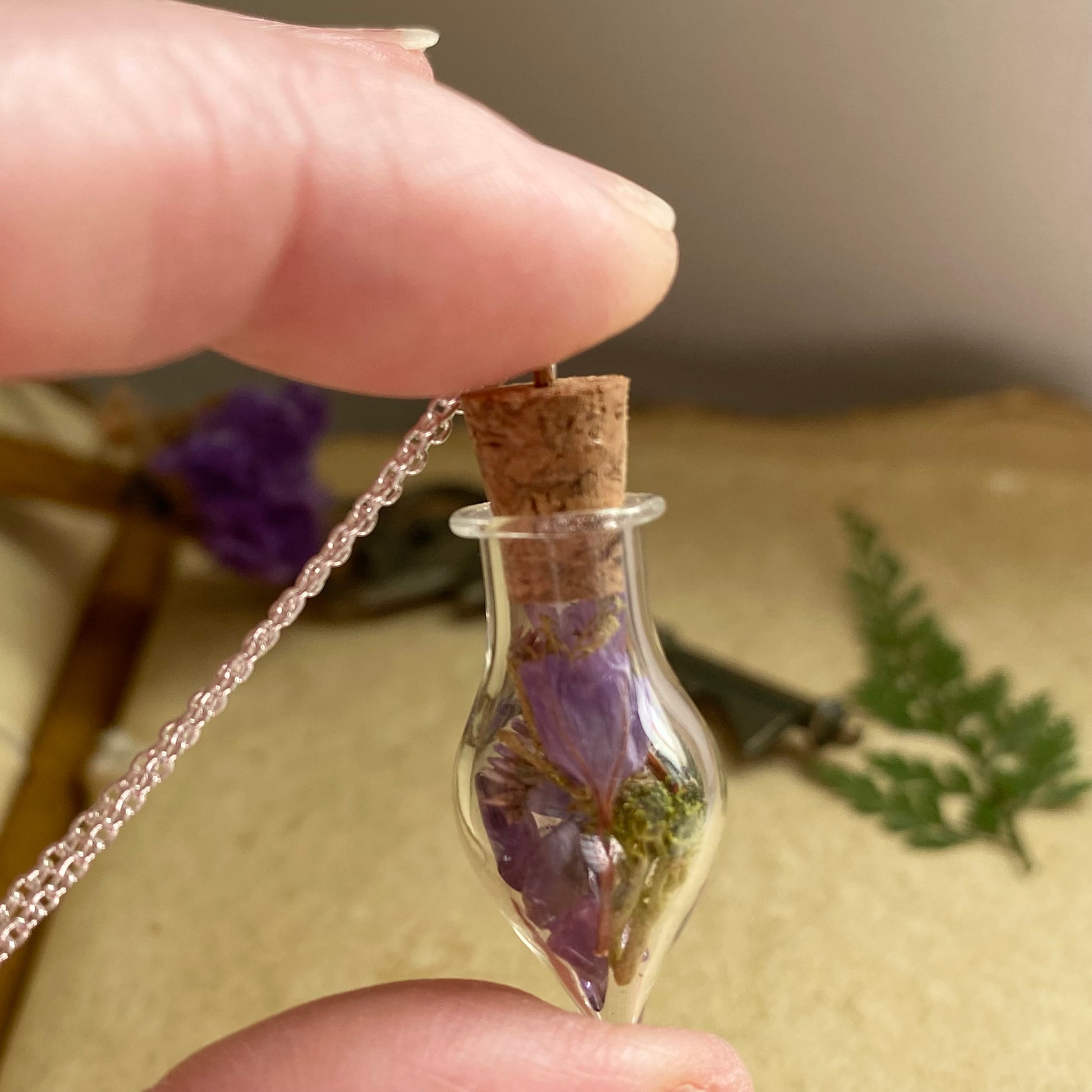 Amethyst, moss, and blossoms of statice and sea lavender, sealed within glass and topped with a cork stopper A tiny keepsake for calm and quiet strength.