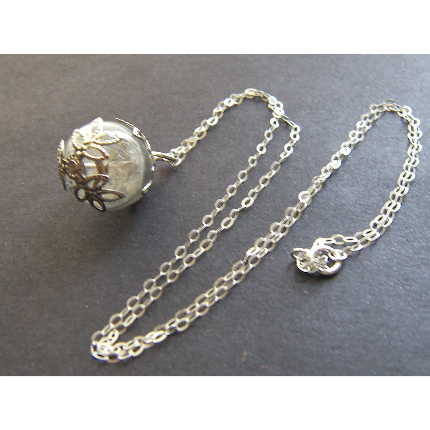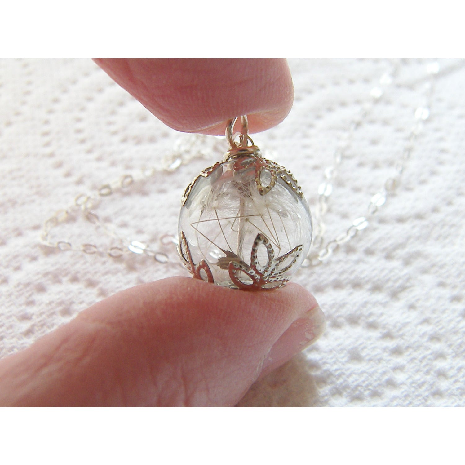 Description: I have very carefully filled these small Beautiful hand blown glass hollow beads measures approx 13mm) with dandelion seeds and attached vintage style filigree caps to top and bottom, they hang from pretty 18" 925 sterling silver chain ( lovely dainty necklaces, such a pretty reminder of childhood innocence and a must have for any nature lover:)