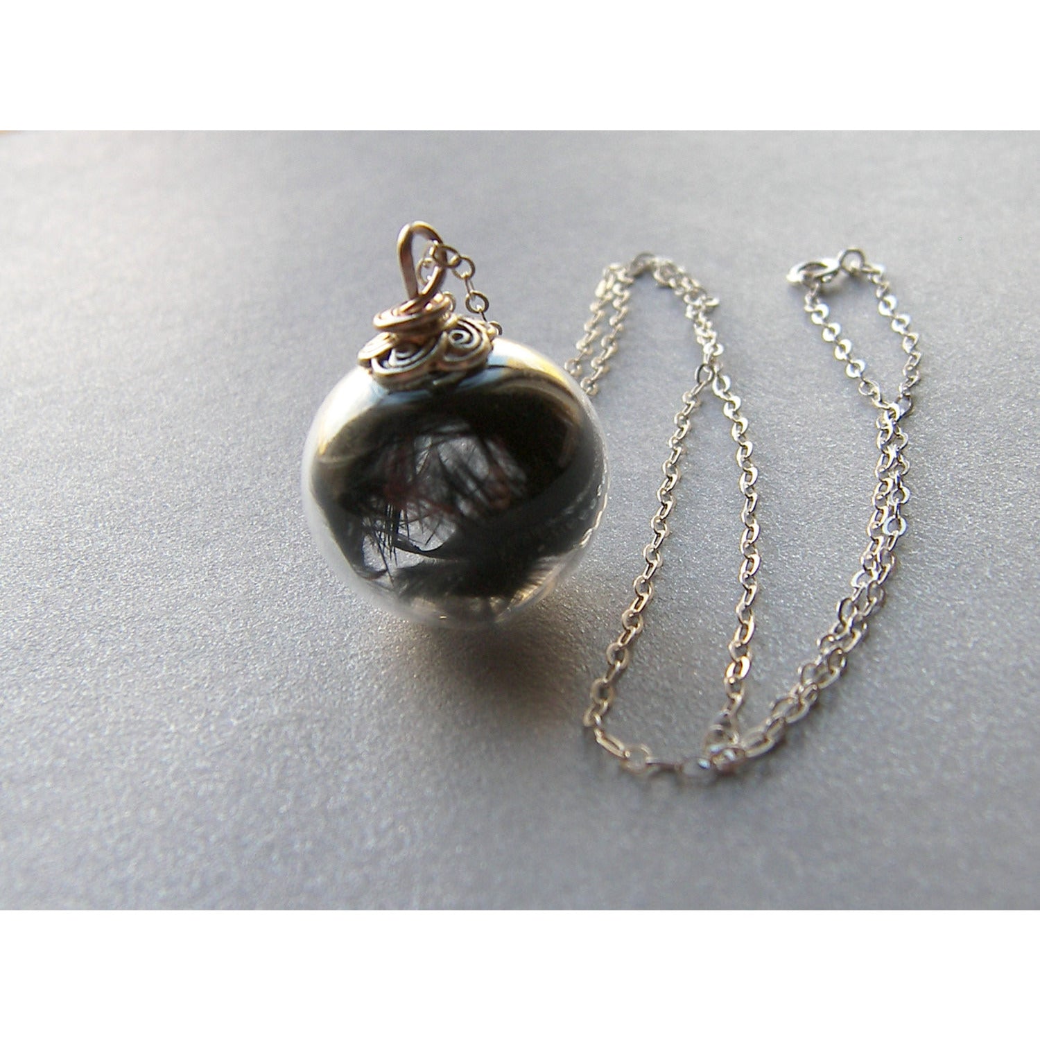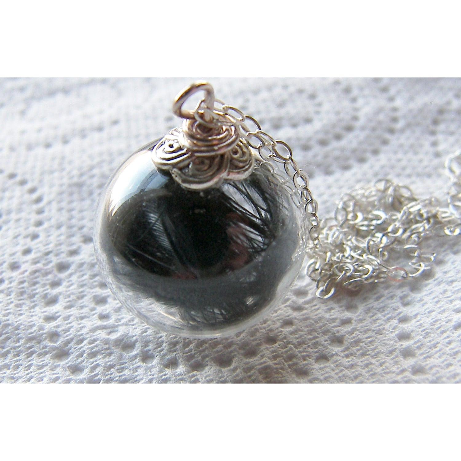 Description: I have very carefully hand filled this Beautiful hand blown glass hollow bead, measures approx 20mm x 20mm with 2 tiny soft fluffy black marabou feathers and attached vintage style cab to the top, hangs from 18" 925 sterling silver chain